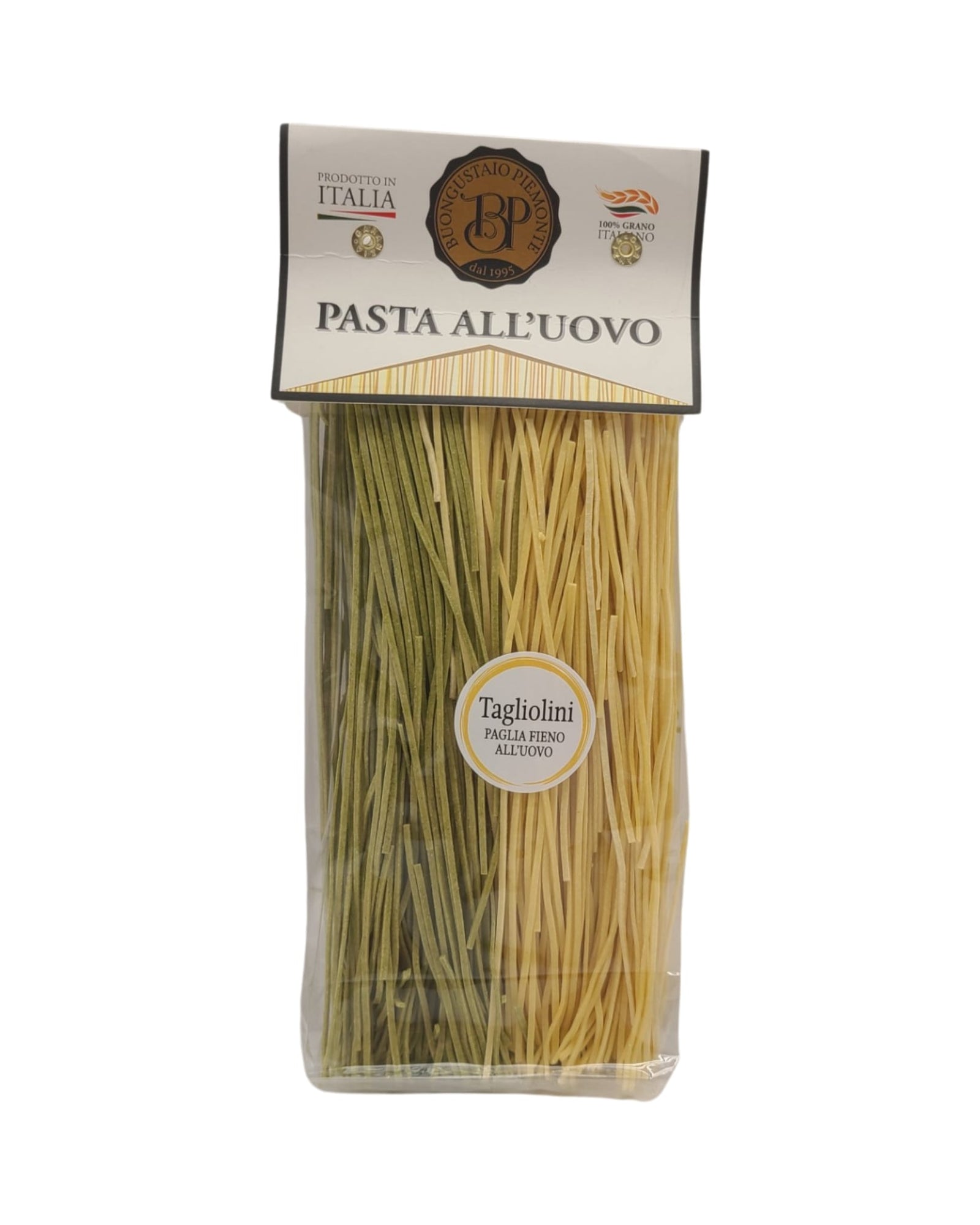 Egg Tagliolini Paglia Fieno (Straw & Hay) Artisan Pasta. Durum wheat semolina pasta with egg. Egg Tagliolini are one of the best Piedmontese and Langhe pastas. Ideal pairing with extra virgin olive oil with Parmigiano Reggiano or meat sauce. Cooking time: 5 minutes.